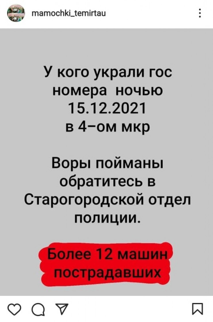Кражи госномеров с автомобилей в Темиртау не редкость. Владельцы автомашин периодически публикуют жалобы на автоворов в социальных сетях.