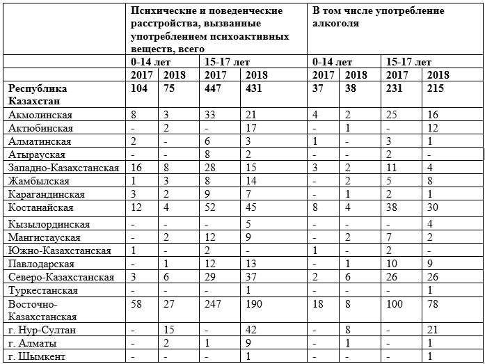 По данным Министерства здравоохранения, в 2017 и 2018 годы в Восточно-Казахстанской области зарегистрирована наибольшая численность больных в возрасте 0-14, 15-17 лет, состоящих на диспансерном наркологическом наблюдении . Наименьшее количество официально состоящих на учете сохраняется в Шымкенте и Туркестанской области, в течение двух лет по два случая.