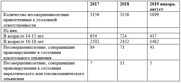 Стоит отметить, что, согласно предоставленным Комитетом по правовой статистике и специальным учетам сведениям, от 2,4 процента до 2,9 процента детей и подростков находились в состоянии алкогольного или наркотического опьянения в момент совершения правонарушения. К примеру,  в 2018 году из 3156 несовершеннолетних, привлеченных к уголовной ответственности, 82 человека были под воздействием алкоголя или запрещенных веществ.
