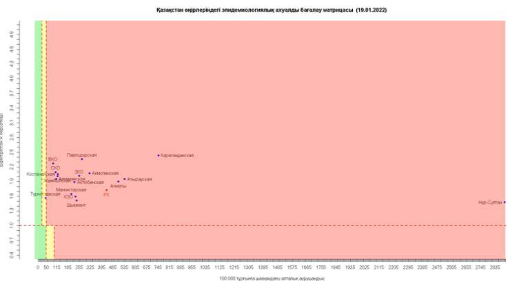 Практически все регионы Казахстана остаются в "красной" зоне, согласно матрице оценки эпидемиологической ситуации на 19 января, передает корреспондент Tengrinews.kz.