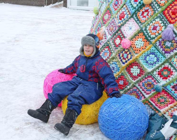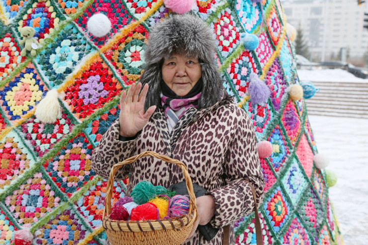 Вязаные квадраты из Нур-Султана и его пригорода, Алматы, Петропавловска, Актобе, Тараза, Караганды собрали в гигантское лоскутное одеяло и надели на металлическую конструкцию в форме елки. Нынешний арт-объект получился вдвое выше прошлогоднего. На новогоднюю инсталляцию потребовалось более 70 килограммов пряжи.