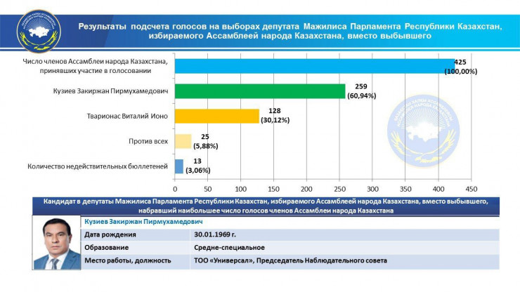 Закиржан Кузиев избран депутатом Мажилиса от Ассамблеи народа Казахстана (АНК). Об этом говорится в сообщении на сайте Центральной избирательной комиссии, передает Tengrinews.kz.