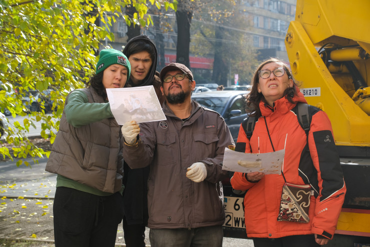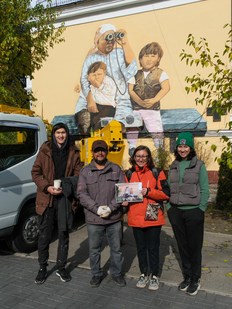Авторы и художники, принимавшие участие в восстановлении мурала "Ожидание". Фото предоставлено пресс-службой акима Алматы