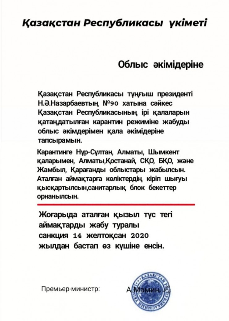 Сообщение о "закрытии регионов на карантин" представляет собой фотографию некого документа, якобы адресованного акимам областей от имени премьер-министра Аскара Мамина. Это фальсификация, пишет портал.