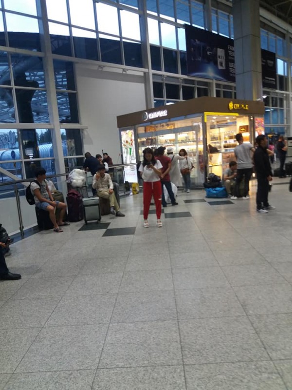 Из зала ожидания аэропорта Алматы убрали сиденья. Люди сидят на чемоданах Фото: Ирина Смирнова/facebook.com