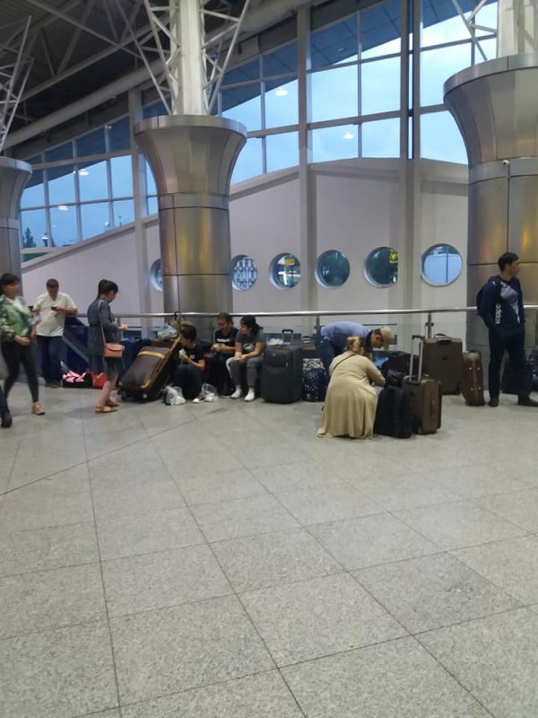 Из зала ожидания аэропорта Алматы убрали сиденья. Люди сидят на чемоданах