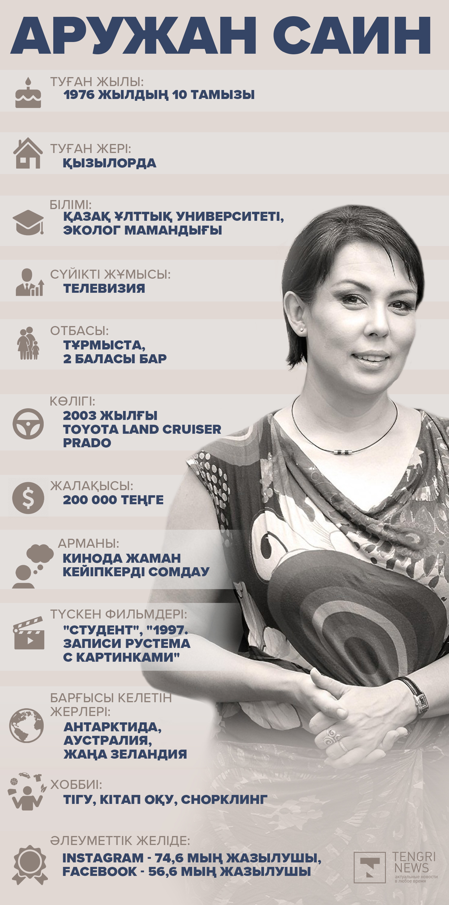 Жалақысы, көлігі, хоббиі. Сіз кімсіз, Аружан Саин? Аружан Саин. © Tengrinews.kz