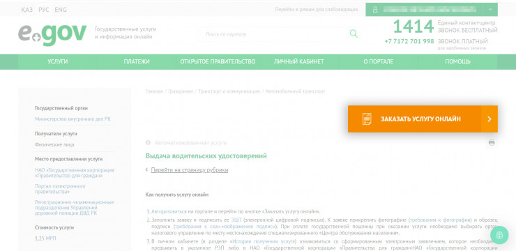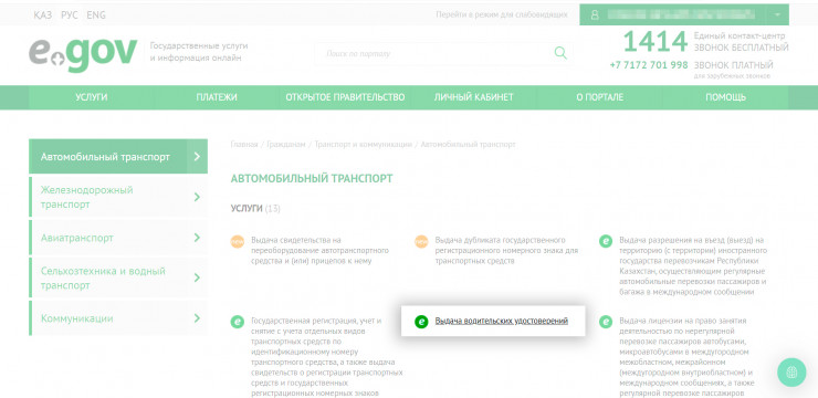 1. На портале egov.kz необходимо авторизоваться с помощью ЭЦП (у кого нет, можно получить удаленно, не выходя из дома), зайти в раздел "Транспорт и коммуникации", далее в подраздел "Выдача водительских удостоверений".