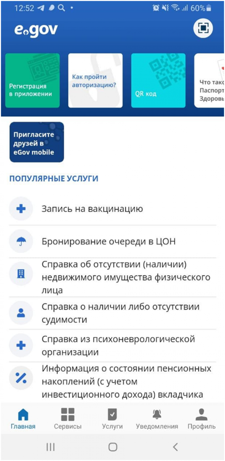 В приложении eGov mobile услуга выведена на главную страницу, а в остальном все аналогично.