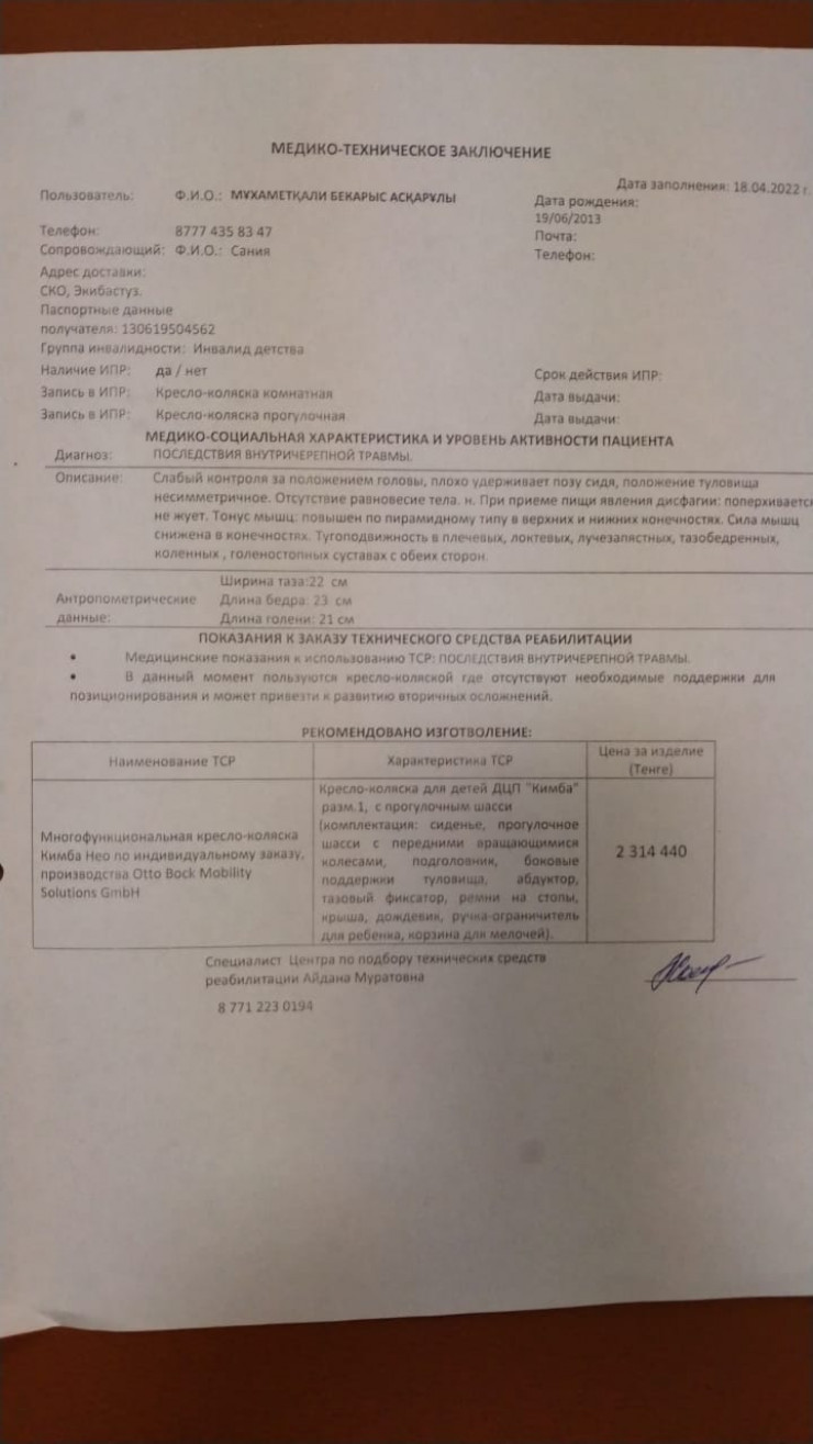 "В данный момент мама находится с братом на реабилитации в Нур-Султане, и врачи сказали, что с его диагнозом нужна специальная многофункциональная инвалидная коляска", - сообщил на видео Арулат Мухаметкали.