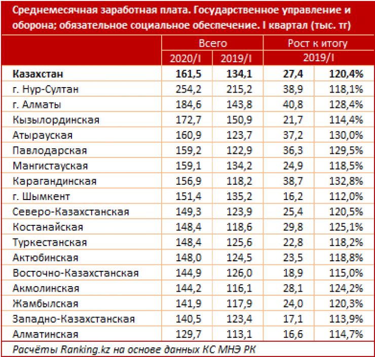 Зарплаты госслужащих сферы государственного управления, обороны и обязательного социального обеспечения выросли более чем на 20 процентов за год, передает Tengrinews.kz со ссылкой на Ranking.kz.