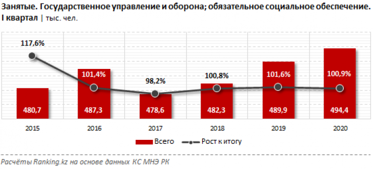Сообщается, что в первом квартале текущего года численность занятых в сфере государственного управления, обороны и обязательного социального обеспечения составила 494,4 тысячи человек - на 0,9 процента больше, чем в аналогичном периоде прошлого года.