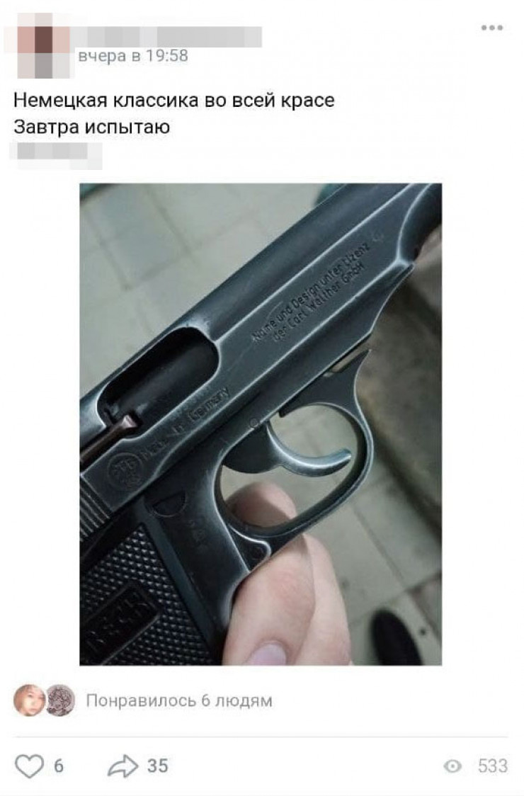 "Со слов молодого человека, он увлекается страйкболом и данный пост выложил с целью увеличить количество подписчиков на своей странице "ВКонтакте". По данному факту проводится досудебное расследование по статье 287 Уголовного кодекса ("Незаконные приобретение, передача, сбыт, хранение, перевозка или ношение оружия"), в рамках которого назначена баллистическая экспертиза в целях установления принадлежности огнестрельного оружия", - сообщили в полиции.