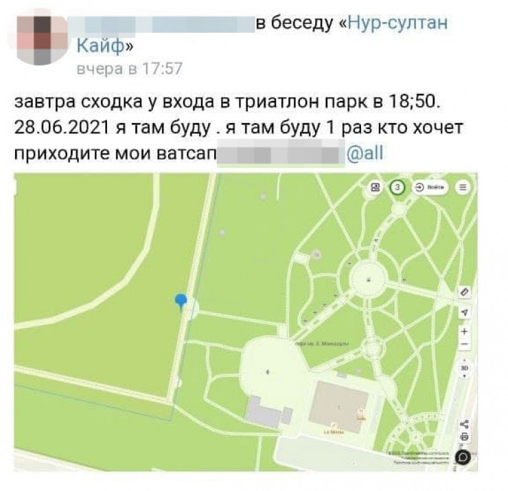 "25 июня пользователь социальной сети "ВКонтакте" на своей странице выложил фотографии с оружием. При этом молодой человек был одет в военизированную форму. Кроме того, на канал "102" поступило сообщение от жителя города, что в социальной сети его сыну приходят фотографии неизвестного человека с оружием и сообщение, что "в столице завтра будет весело", - прокомментировали в Департаменте полиции Нур-Султана.