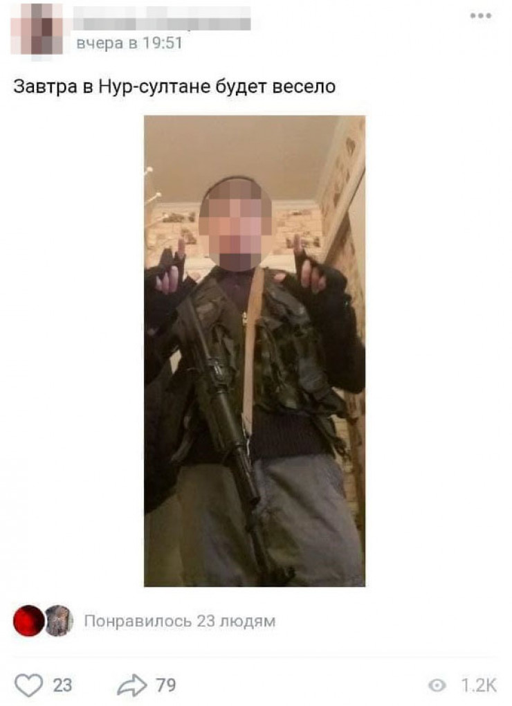 Пользователей насторожили публикации мужчины в социальной сети VK. На одном из фото автор предстал в военизированной форме с оружием. Эту публикацию он сопроводил словами: "Завтра в Нур-Султане будет весело".