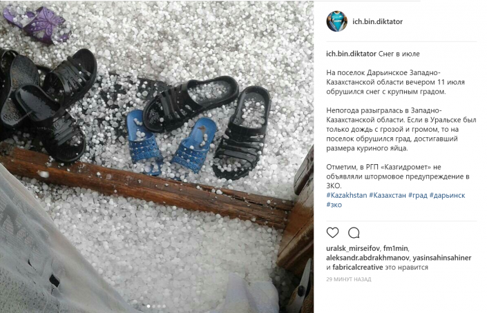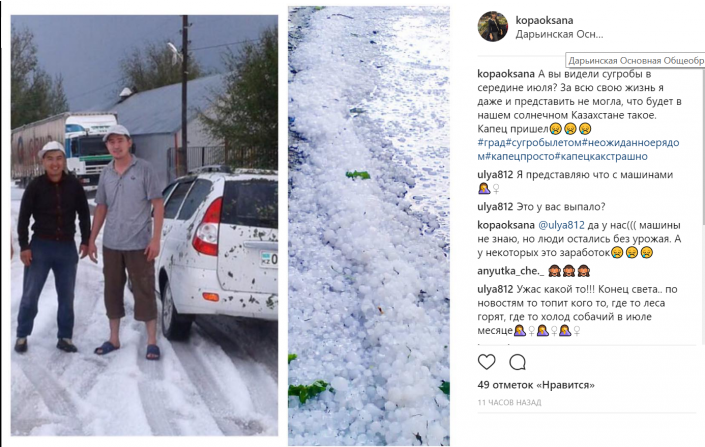 "А вы видели сугробы в середине июля? За всю свою жизнь я даже и представить не могла, что будет в нашем солнечном Казахстане такое", - пишет пользователь Instagram под ником @kopaoksana