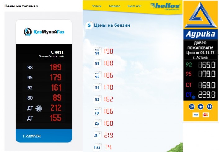 Как отмечается на сайте компании, литр зимнего дизтоплива продается по 212 тенге. Летнее дизельное топливо стоит 155 тенге. На АЗС сети Helios литр зимнего дизтоплива стоит 219 тенге. На заправках компании "Аурика" зимнее дизельное топливо стоит 229 тенге.
