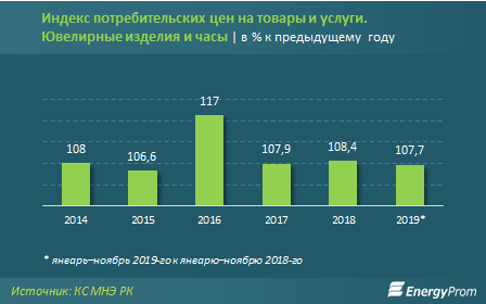 По итогам 11 месяцев в стране произвели ювелирных изделий на 668,5 миллиона тенга против 648,1 миллиона годом ранее. Впрочем, по данным Комитета по статистике, индекс промышленного производства в секторе составил всего 96,4 процента, что говорит о спаде выпуска в реальном выражении.