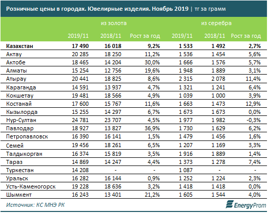 Серебряные ювелирные изделия подорожали на 2,7 процента за год, до 1,5 тысячи тенге по итогам ноября 2019-го. Дороже всего они стоят в Атырау (2,3 тысячи тенге, +11,4 процента за год), Нур-Султане (две тысячи тенге, -0,3 процента за год) и Алматы (1,9 тысячи тенге, + 3,1 процента за год).