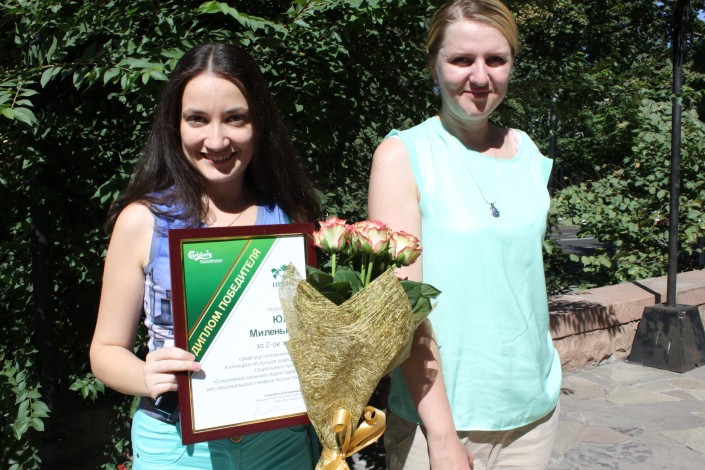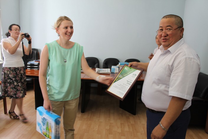 Журналисты "Алаш Медиа Групп" стали призерами конкурса по освещению проблем снежного барса Мария Горохова от имени организаторов конкурса вручает корреспонденту Tengrinews.kz Розе Есенкуловой приз.