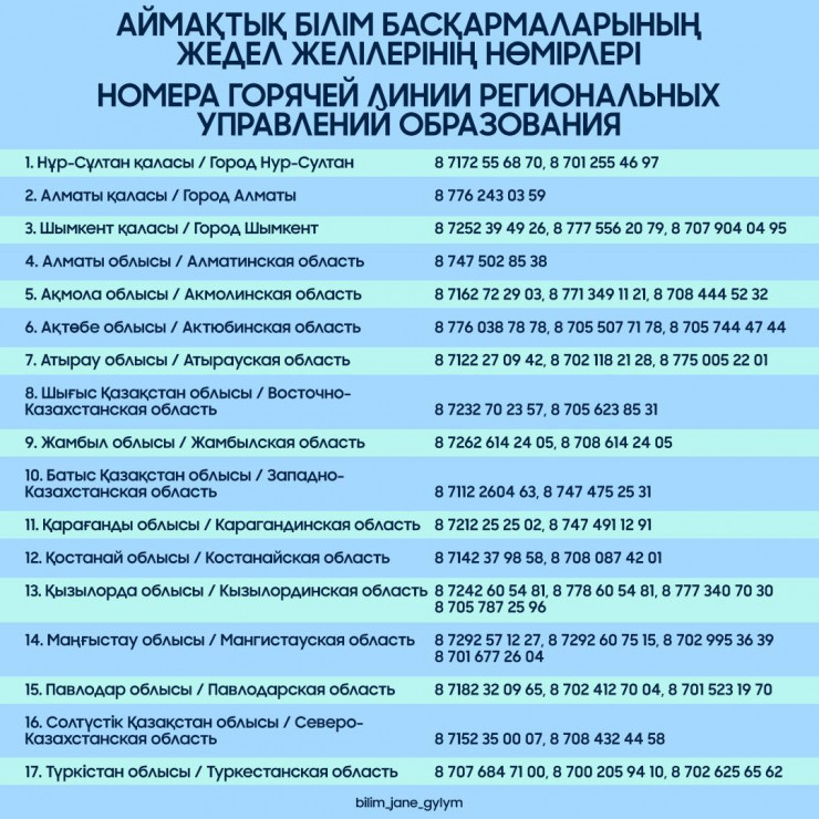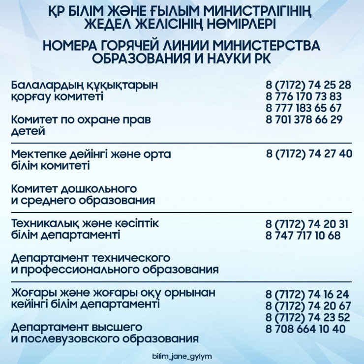В Комитет по охране прав детей можно дозвониться по следующим номерам: 8 (7172) 74 25 28, +7 776 170 73 83, +7 777 183 65 67, +7 701 378 66 29.