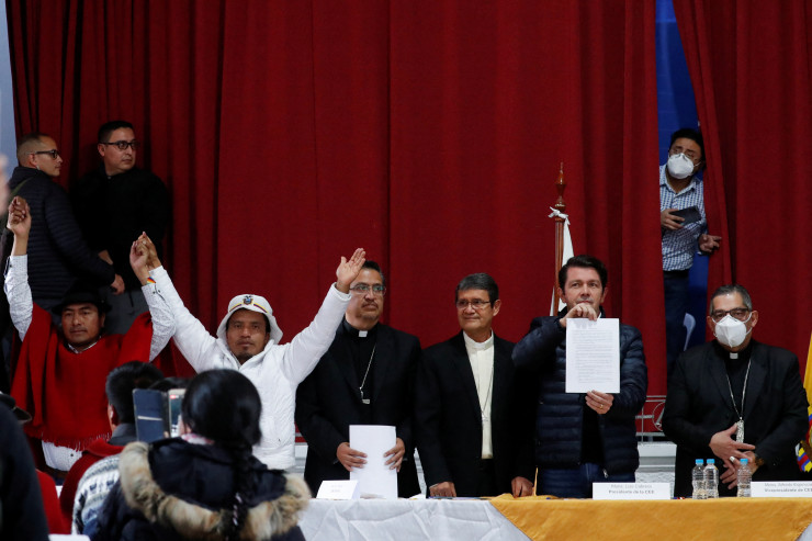 Министр правительства и управления политикой Франсиско Хименес и лидер коренного населения CONAIE Леонидас Иза были среди подписавших соглашение, как и участник переговоров, глава Епископальной конференции в Эквадоре Луис Кабрера.