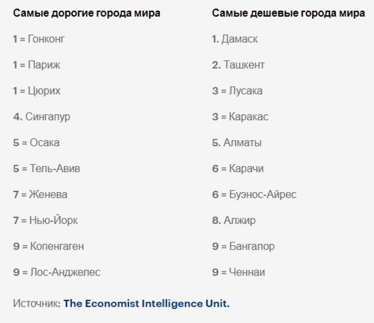 Список самых дешевых городов открыл Дамаск, столица раздираемой войной Сирии. Алматы занял пятое место, после города Лусака в Замбии и столицы Венесуэлы Каракаса.