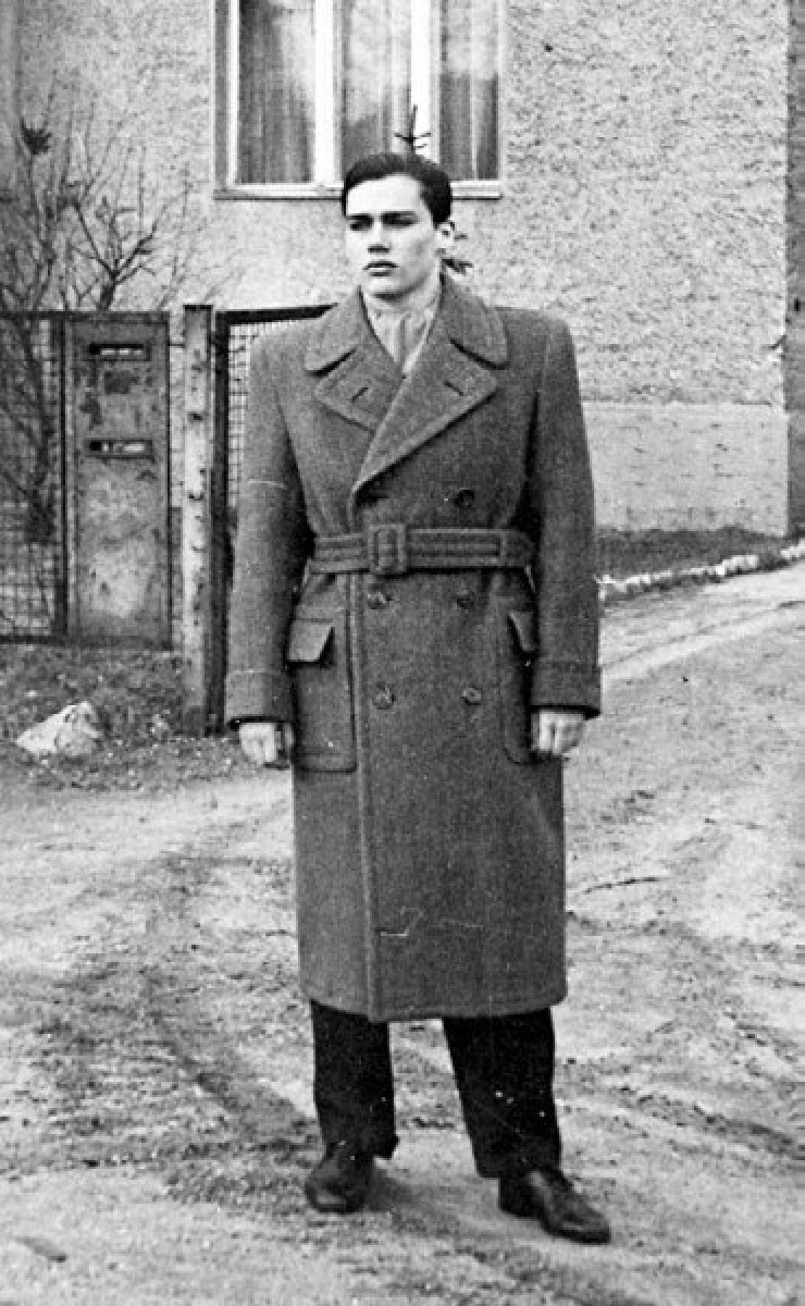 Один из снимков был портретным, дата его съемки (как и дата второго) неизвестна, но по внешнему виду здесь телеведущему можно дать не больше 23 лет. На втором кадре Познер стоит в старомодном (на тот момент наимоднейшем) стеганом пальто где-то на улице.