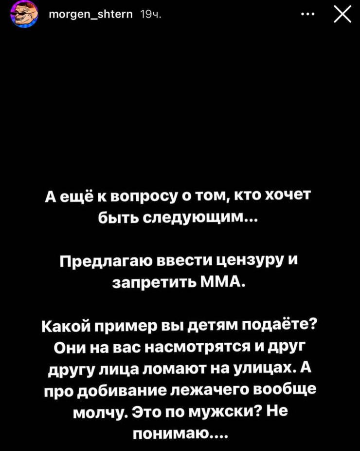 "Какой пример вы детям подаете? Они на вас насмотрятся и друг другу лица ломают на улицах. А про добивание лежачего вообще молчу. Это по-мужски? Не понимаю", - написал Моргенштерн в сторис своего Instagram