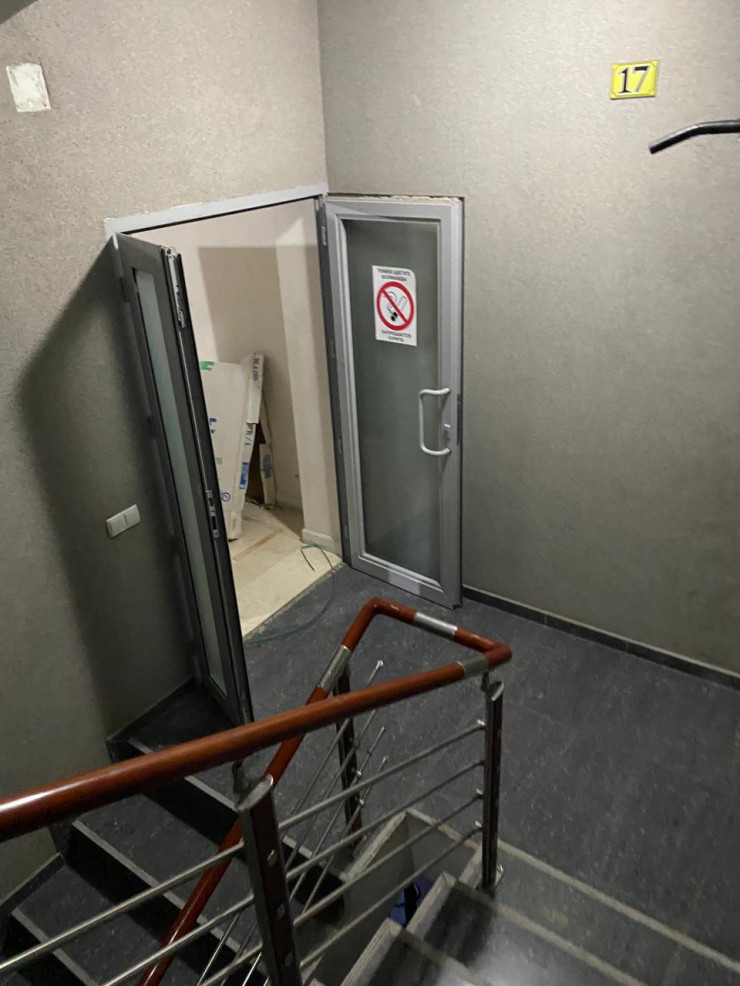 В подъезде сильно пахнет порохом. На 17-м этаже вынесена мебель, по всей видимости, из квартиры стрелка. Однако на его этаже тихо и спокойно, будто никто не живет.