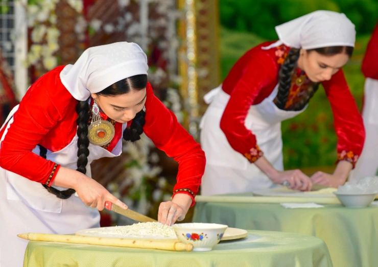 Во второй части конкурса девушки, руководствуясь книгой Президента Туркменистана "Благословенный туркменский стол", соревновались в нарезании лапши унаш - туркменского блюда.