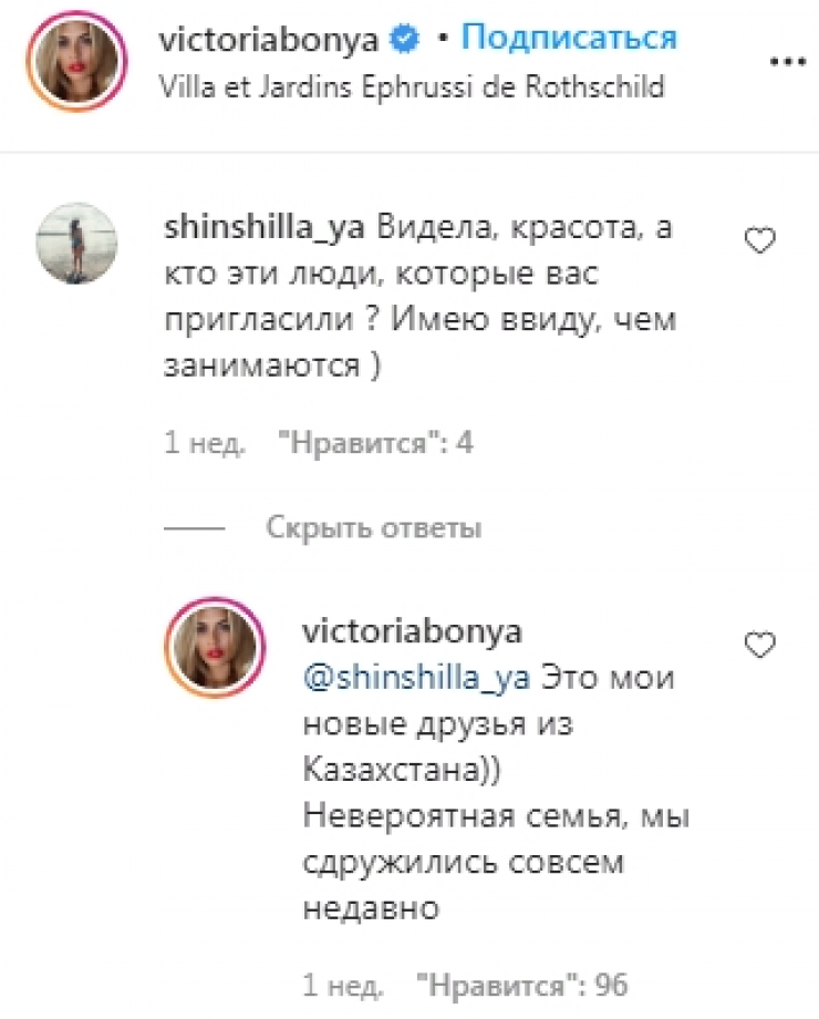 На вопрос одной из пользовательниц, кто ее пригласил на виллу, Боня ответила: "Это мои новые друзья из Казахстана. Невероятная семья, мы сдружились совсем недавно".