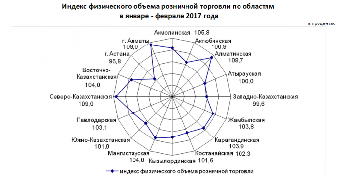 Индекс физического объема розничной торговли в Астане в январе - феврале 2017 года составил 95,8 процента, что является самым низким показателем среди регионов Казахстана, передает корреспондент Tengrinews.kz со ссылкой на Комитет по статистике Министерства национальной экономики Республики Казахстан.