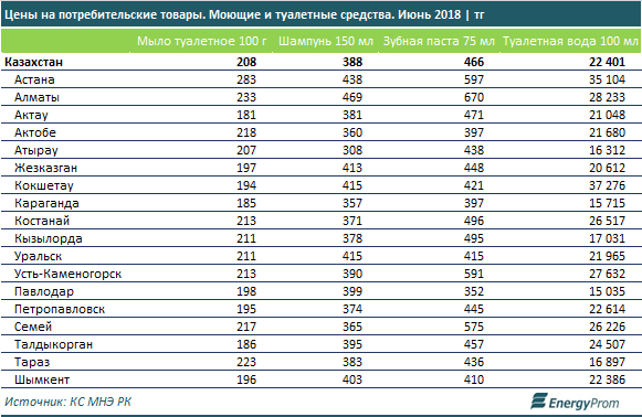 На 8,6 процента увеличилась стоимость зубной пасты - до 466 тенге за тюбик 75 миллилитров. На 5,1 процента за год выросли цены на туалетную воду - до 22,4 тысячи тенге за флакон 100 миллилитров.