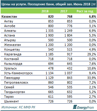 По итогам июня стоимость похода в баню выросла за год на 6,8 процента. Посещение общего зала обходится казахстанцам в среднем уже в 820 тенге. Дороже всего гигиена обходится жителям Астаны (1 900 тенге за посещение, +5,3 процента за год) и Алматы (1 335 тенге, +6,9 процента).