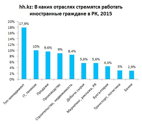 При этом, по ее информации, несколько уменьшилась доля резюме граждан Узбекистана, Кыргызстана и Азербайджана. В большинстве своем, согласно данным компании, иностранные граждане стремятся работать в следующих отраслях: топ-менеджмент (17,9 процента), информационные технологии, телекоммуникации (10 процентов), продажи (9,6 процента), производство (9 процентов), строительство и недвижимость (8,4 процента).