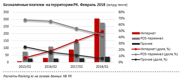 Через интернет-ресурсы в январе-феврале 2018 года проведен наибольший объем безналичных платежей - 306,4 миллиарда тенге, годовой рост сразу в 3,4 раза. Доля от безнала выросла с 34,6 процента до 49,3 процента.