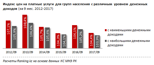 В категории платных услуг без изменений - для малообеспеченных жителей страны цены растут существенно быстрее, чем для наиболее обеспеченных. Хотя в этом году рост цен менее резкий, чем в прошлом, стоимость услуг для населения с наименьшими доходами выросла на 4,4 процента против роста на 6,1 процента годом ранее. Казахстанцы с самими высокими доходами покупают услуги на 3,9 процента дороже, чем в начале года, - против инфляции на 5,2 процента за аналогичный период прошлого года.