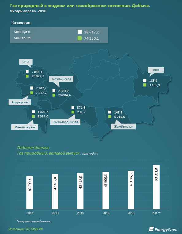 Из трех ключевых "газовых" регионов в плюсе - два. Так, добыча в Атырауской области выросла год-к-году сразу на 16,4 процента, до 7,8 миллиарда кубометров, в Актюбинской - на 4,1 процента, до 2,3 миллиарда кубометров.