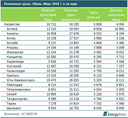 В первый месяц весны мужская кроссовая обувь стоила в розничных точках продаж в среднем 10,7 тысячи тенге - на 8,2 процента дороже, чем годом ранее.