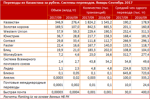 Замыкает тройку лидеров система переводов "Юнистрим" - объем за январь-сентябрь составил 36,7 миллиарда тенге, годом ранее - 28,8 миллиарда. Количество транзакций выросло со 158,3 тысячи до 217,7 тысячи. Средний чек уменьшился со 181,9 тысячи до 168,4 тысячи тенге.