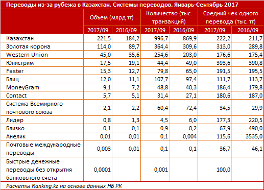 Количество транзакций по сравнению с аналогичным периодом 2016 года увеличилось на 18,8 процента, до 1,8 миллиона, из РК за рубеж и на 14,6 процента, до 996,7 тысячи, из-за рубежа в РК. Средний чек одного перевода, отправленного из РК за рубеж, за год вырос со 178,9 тысячи до 190,2 тысячи тенге, полученного из-за рубежа в РК вырос с 211,7 тысячи до 222,2 тысячи тенге.