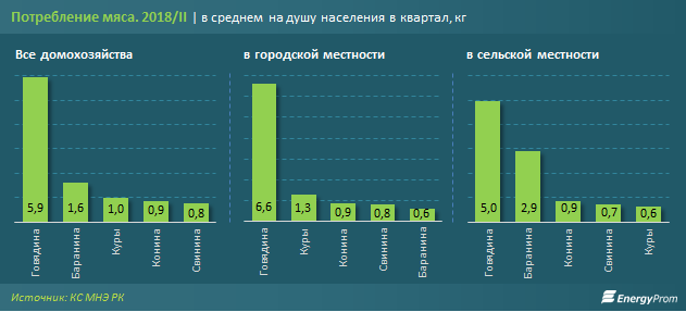 Из мяса особой популярностью среди домохозяйств во втором квартале 2018 года пользуется говядина - 5,9 килограмма на душу населения, следом идет баранина - 1,6 килограмма и куры - один килограмм.