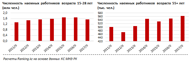 Особенно активно молодых кадров лишается рынок наемного труда - за год число наемных работников возраста 15-28 лет уменьшилось на 9,1 процента, или на 153,5 тысячи человек. Дефицит молодых кадров частично закрывается более возрастной категорией - в последние 5 лет численность наемных работников возраста 55+ выросла на 19,5 процента.