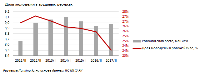 Отмечается, что по сравнению с 2 кварталом 2016 года число таких казахстанцев уменьшилось на 6,9 процента. Доля молодых в численности рабочей силы упала до 23,6 с 25,5 процента. Сама численность экономически активного населения в РК увеличивается, хотя и достаточно низкими темпами. За год объем рабочей силы вырос на 0,5 процента, или на 48 тысяч человек.