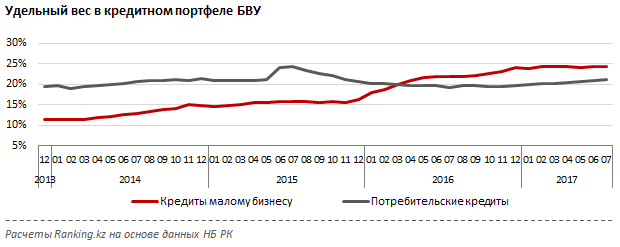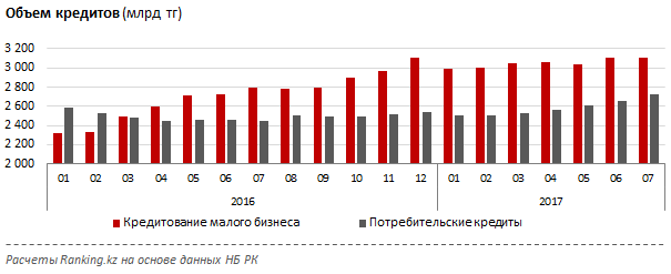 В 2016 году малый бизнес выступил драйвером кредитного рынка. За год объем займов в этом секторе увеличился в полтора раза, на 1 триллион тенге. А по итогам семи месяцев 2017 года портфель банков по малым компаниям прибавил всего 0,2 процента. При возрастающем спросе на потребкредиты у малого бизнеса как кредитной ниши мало преимуществ: во-первых, долгий цикл возврата средств, во-вторых, намного выше себестоимость оценки кредитных рисков. В розничном кредитовании цикл возврата денег короче, маржа выше.