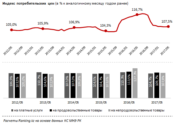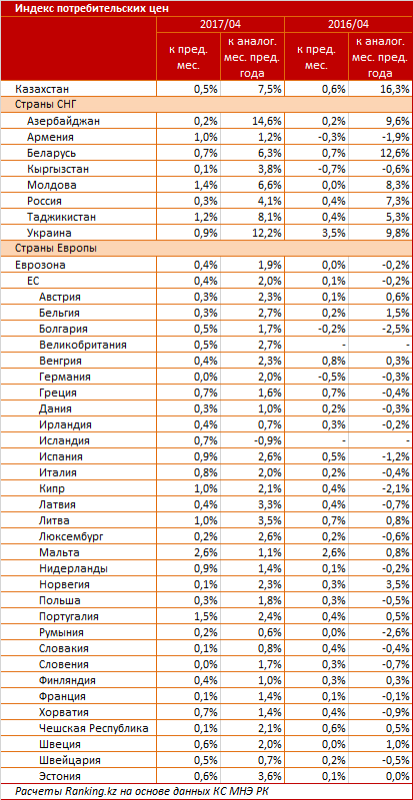 По итогам апреля годовые показатели инфляции в РК заметно уступали соответствующим показателям в Азербайджане (где потребительские цены подскочили на 14,6 процента), Украине (12,2 процента) и Таджикистане (8,1 процента). В то же время у соседей по ЕАЭС показатели инфляции ниже, чем в РК: Кыргызстан - 3,8 процента, Россия - 4,1 процента, Беларусь - 6,3 процента, Армения - 1,2 процента. Для сравнения, самый высокий показатель инфляции в Еврозоне - в странах Прибалтики: всего 3,6 процента у Эстонии, 3,5 процента у Литвы и 3,3 процента у Латвии. В среднем по Еврозоне инфляция держится на уровне 1,9 процента, по ЕС - 2 процента.