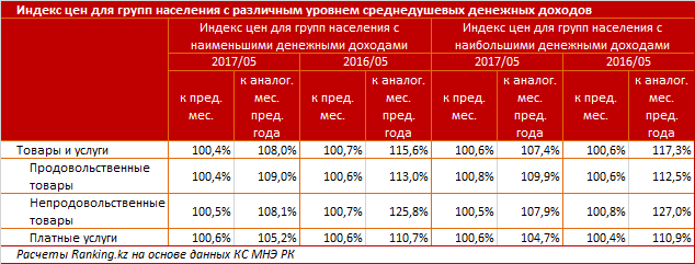Сообщается, что годом раньше картина была противоположной. Уровень инфляции для казахстанцев с наименьшими доходами был ниже - 15,6 против 17,3 процента для казахстанцев с наибольшими денежными доходами. Примечательно, что расходы разных групп различаются, так, доля продовольственных товаров в структуре расходов семей с наименьшими доходами составляет 54,7 процента, с наибольшими - 28,7 процента, непродовольственных - соответственно 21,5 и 37,6 процента, платных услуг - 23,8 и 33,7 процента.
