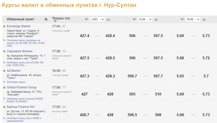 По данным kurs.kz, в обменных пунктах Нур-Султана евро продают за 507,5-510 тенге, покупают за 505-506,7 тенге. Продажа доллара сложилась на уровне 428-428,5 тенге, покупка - 426,7-427,5 тенге.