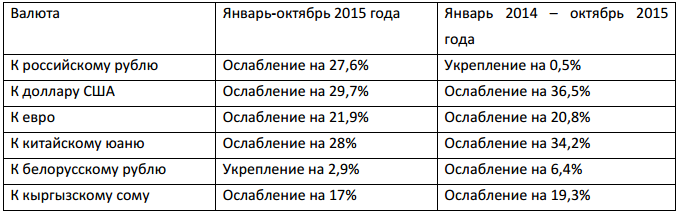 Отмечается, что за 10 месяцев 2015 года ослабление тенге к рублю составило 27,6 процента. При этом, с начала 2014 года по октябрь 2015 года тенге практически достиг паритета к рублю и даже немного укрепился. Напомним, в 2014 году наблюдалось значительное ослабление российской валюты. Также Нацбанк привел таблицу с примерами ослабления или укрепления тенге к ряду других валют.